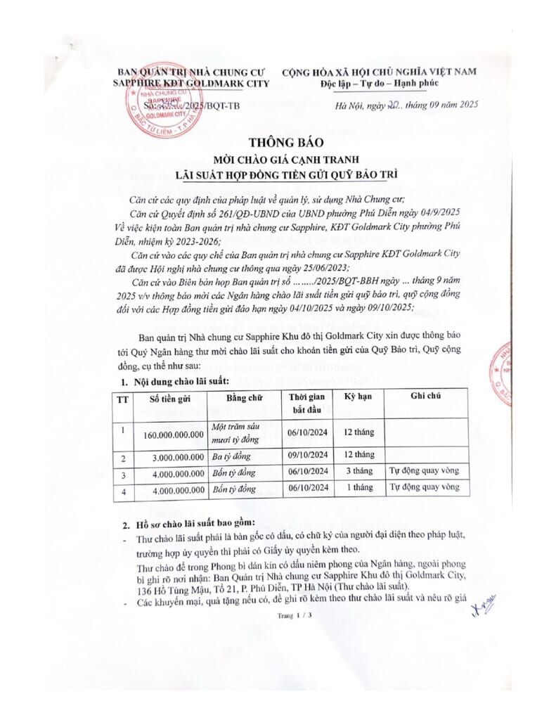 Ban quản trị Nhà chung cư Sapphire Khu đô thị Goldmark City xin được thông báo tới Quý Ngân hàng thư mời chào lãi suất cho khoản tiền gửi của Quỹ Bảo trì, Quỹ cộng đồng, cụ thể như sau: