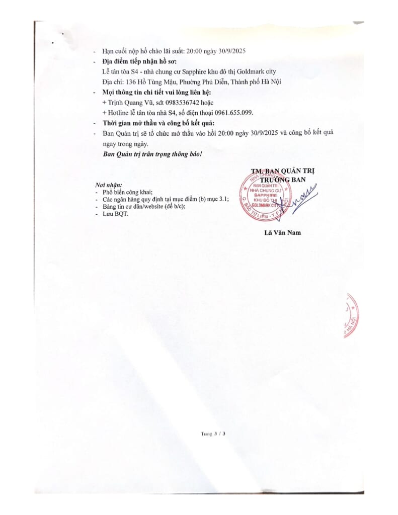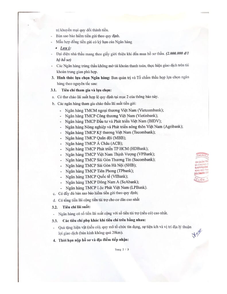 Thư chào để trong Phong bì dán kín có dấu niêm phong của Ngân hàng, ngoài phong bì ghi rõ nơi nhận: Ban Quản trị Nhà chung cư Sapphire Khu đô thị Goldmark City, 136 Hồ Tùng Mậu, Tổ 21, P. Phú Diễn, TP Hà Nội (Thư chào lãi suất).